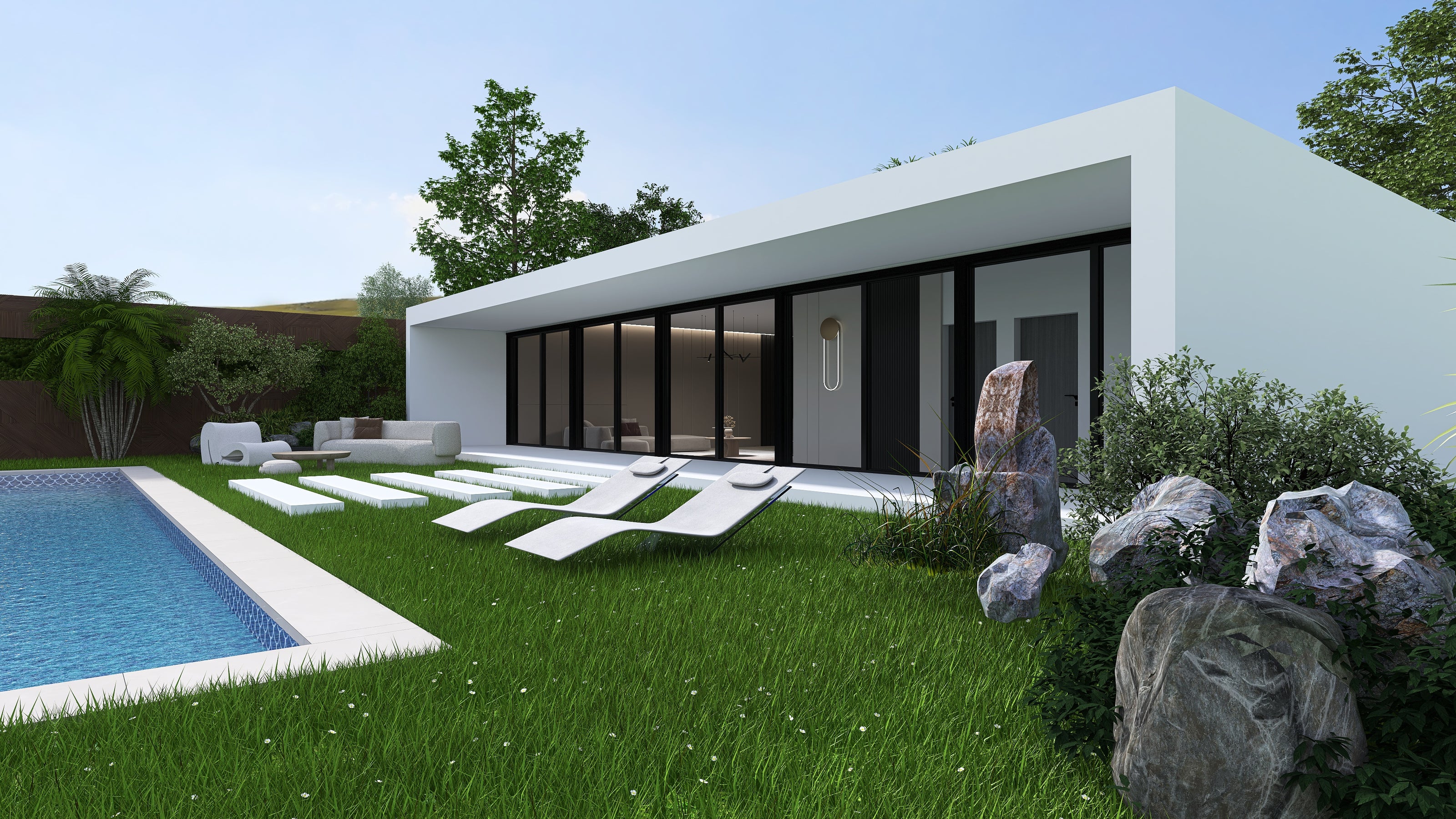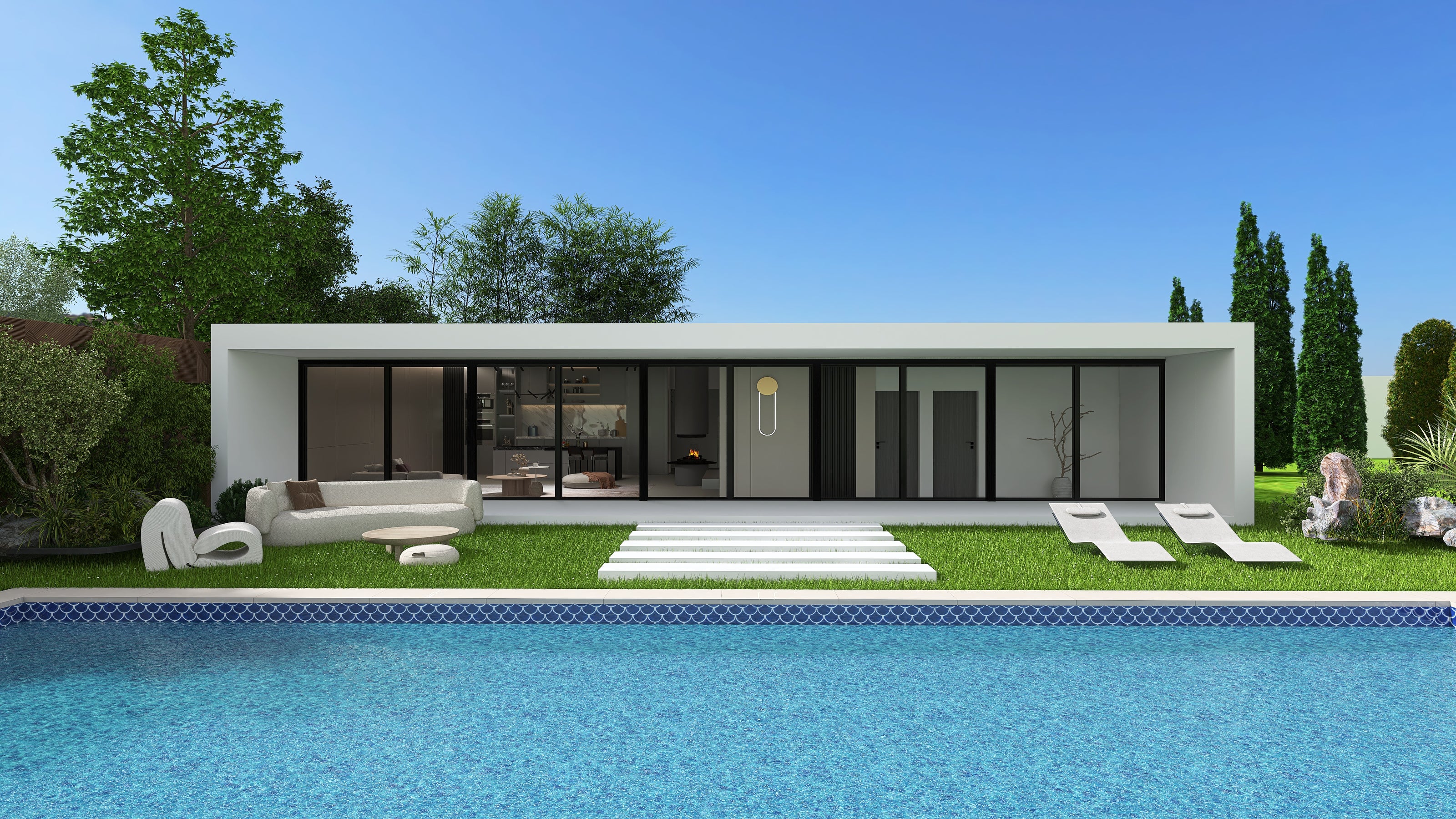 Maison au design rectangulaire et contemporain se distingue par son architecture épurée et ses lignes nettes. La piscine, située devant la maison, apporte une touche de fraîcheur et d'élégance, créant un lien parfait entre l’intérieur et l’extérieur.