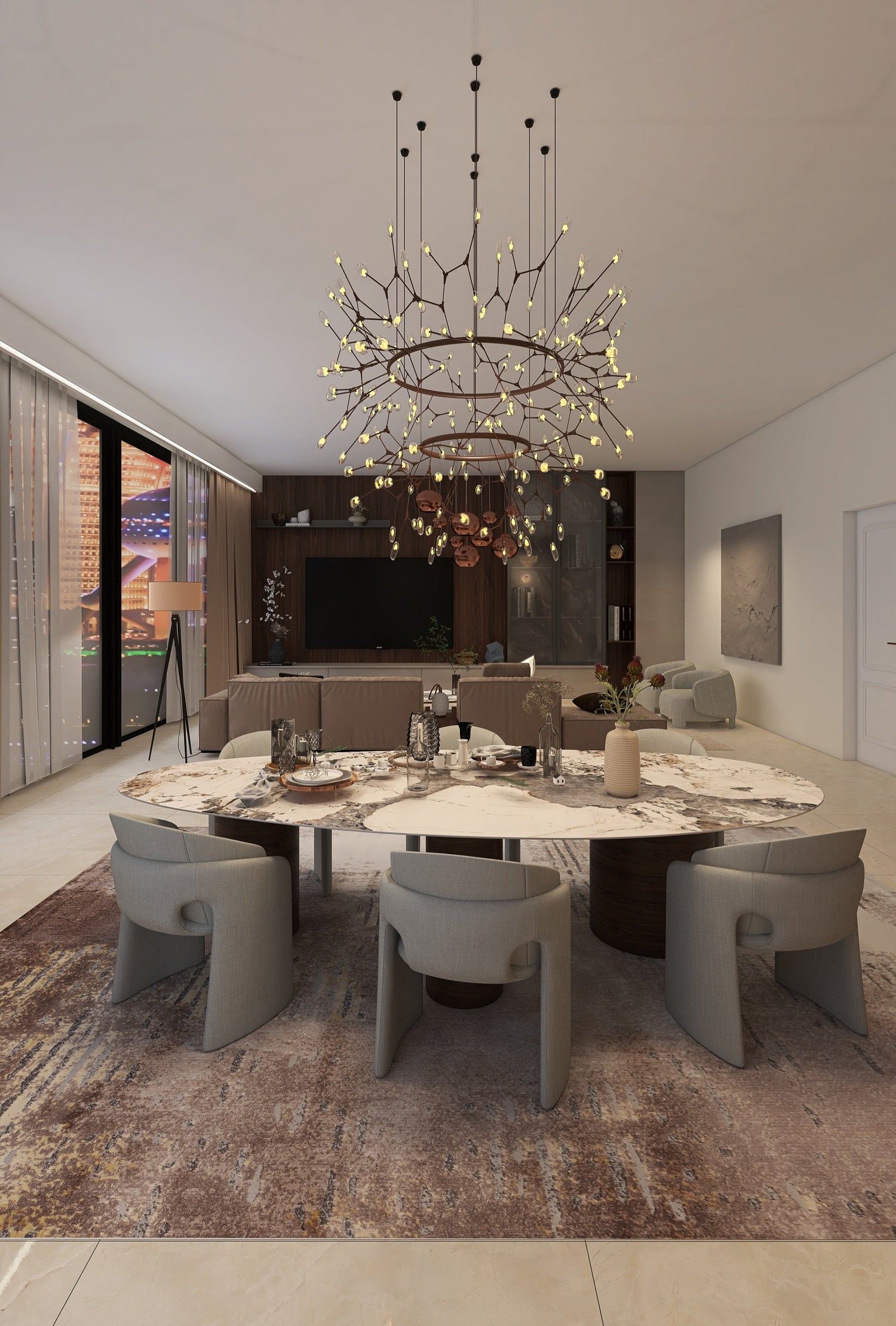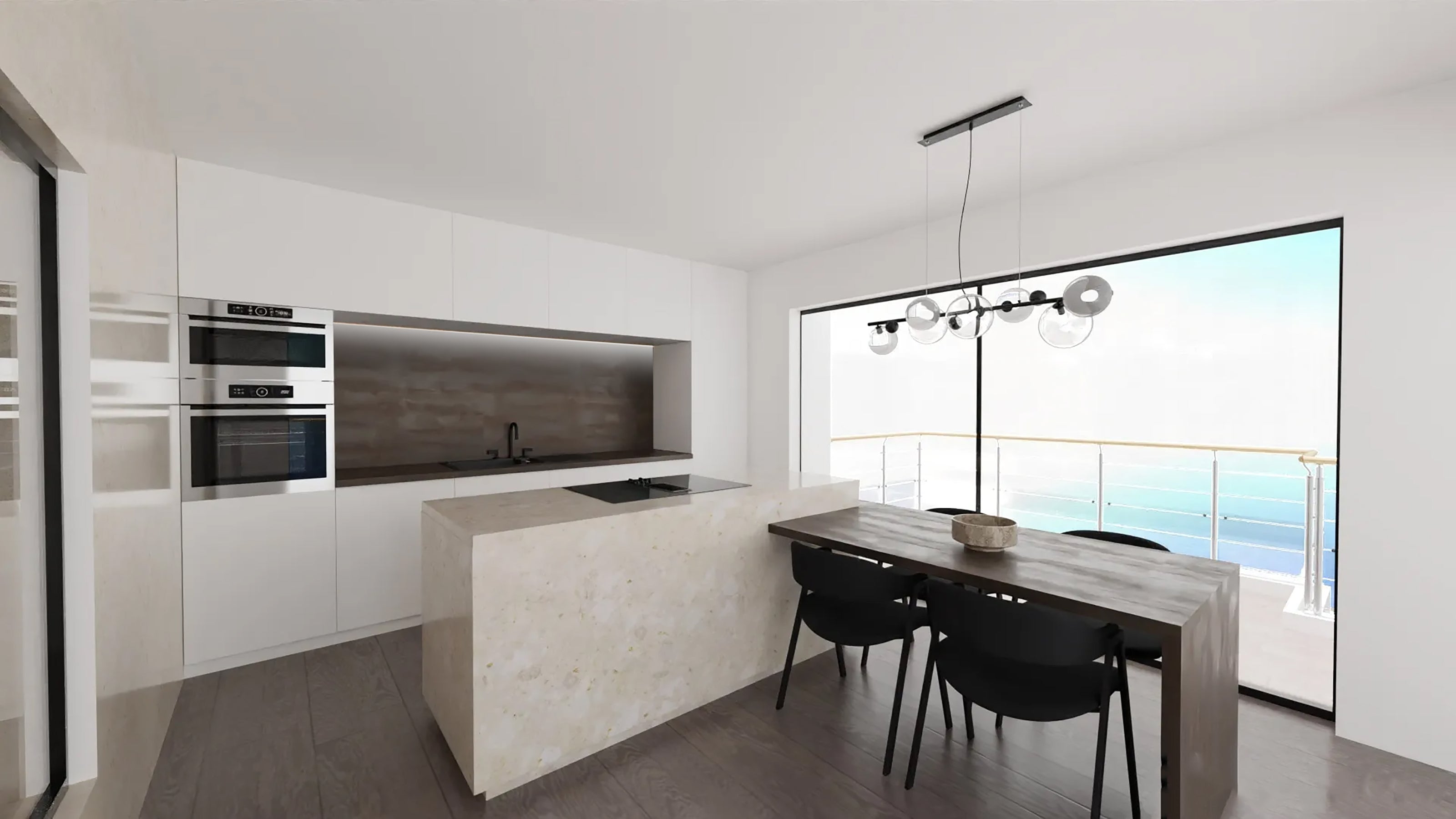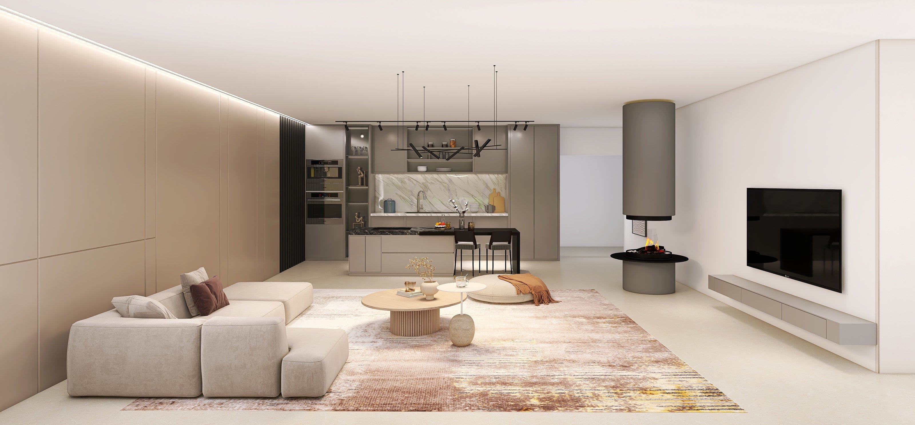 À l’intérieur, le salon adopte une palette de tons beiges, gris et taupe, apportant une chaleur agréable à l’ensemble, tout en conservant une ambiance moderne et sophistiquée. Ces nuances créent une atmosphère apaisante et accueillante, idéale pour se détendre. Le plan de travail de la cuisine, en marbre blanc, ajoute une note de luxe discret tout en soulignant l’aspect contemporain de la maison.