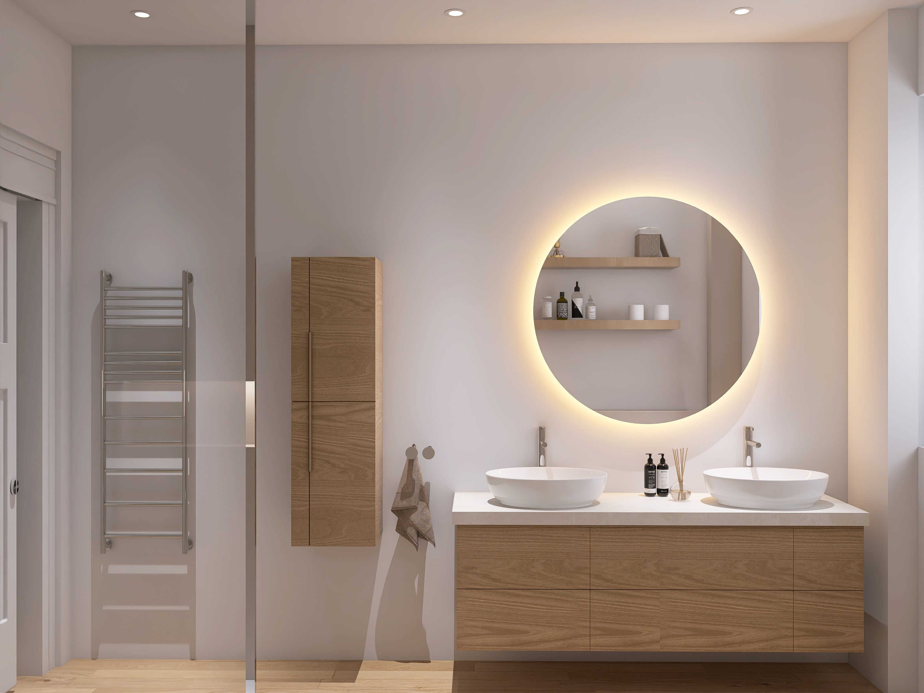L’éclairage indirect, subtilement intégré autour du miroir, renforce la sensation de confort et de douceur, en apportant une lumière tamisée idéale au quotidien. Cette rénovation sur mesure reflète une volonté d’allier confort, esthétisme et fonctionnalité dans les moindres détails, pour un espace bien-être élégant et intemporel.