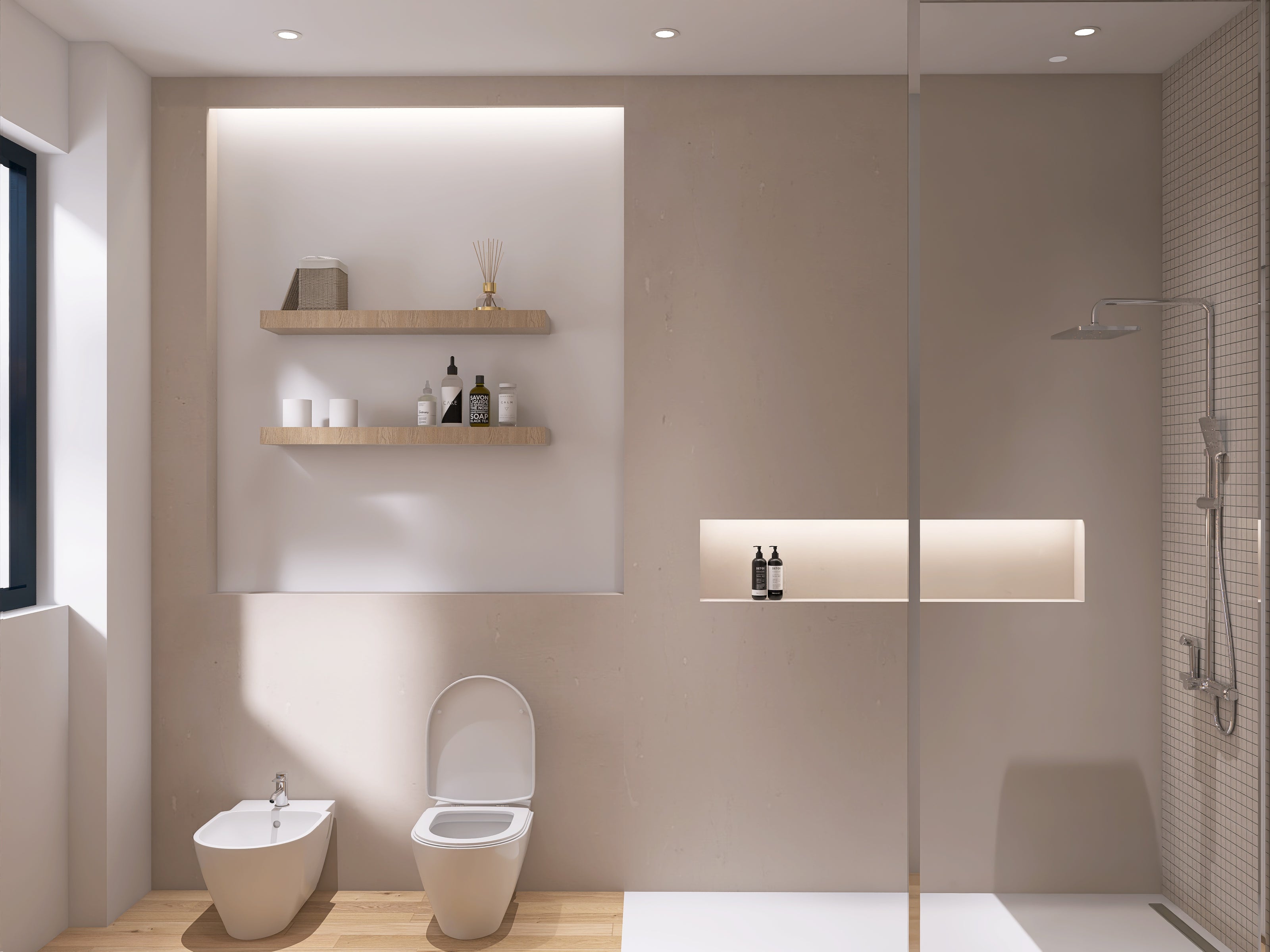 Chaque élément a été soigneusement sélectionné pour créer une ambiance à la fois fonctionnelle et apaisante. L’espace a été entièrement repensé autour d’une douche à l’italienne, dotée d’une paroi vitrée minimaliste et d’une niche intégrée pour plus de praticité. Le mobilier, réalisé sur mesure et suspendu, allège visuellement la pièce tout en offrant un rangement discret et efficace.