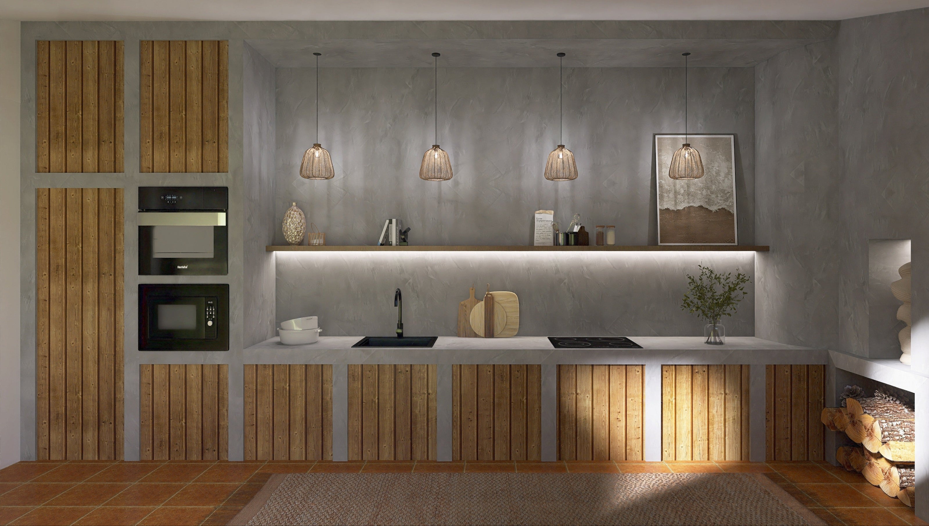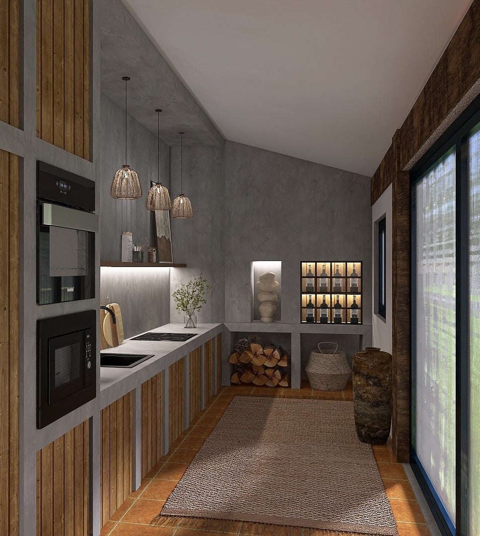 La cuisine en béton ciré pour un rendu brut et contemporain, aux façades en bois qui viennent réchauffer l’espace. Des suspensions soigneusement choisies renforcent le caractère rustique, tout en apportant une touche de douceur et d’authenticité à l’ensemble.