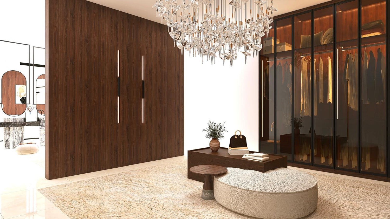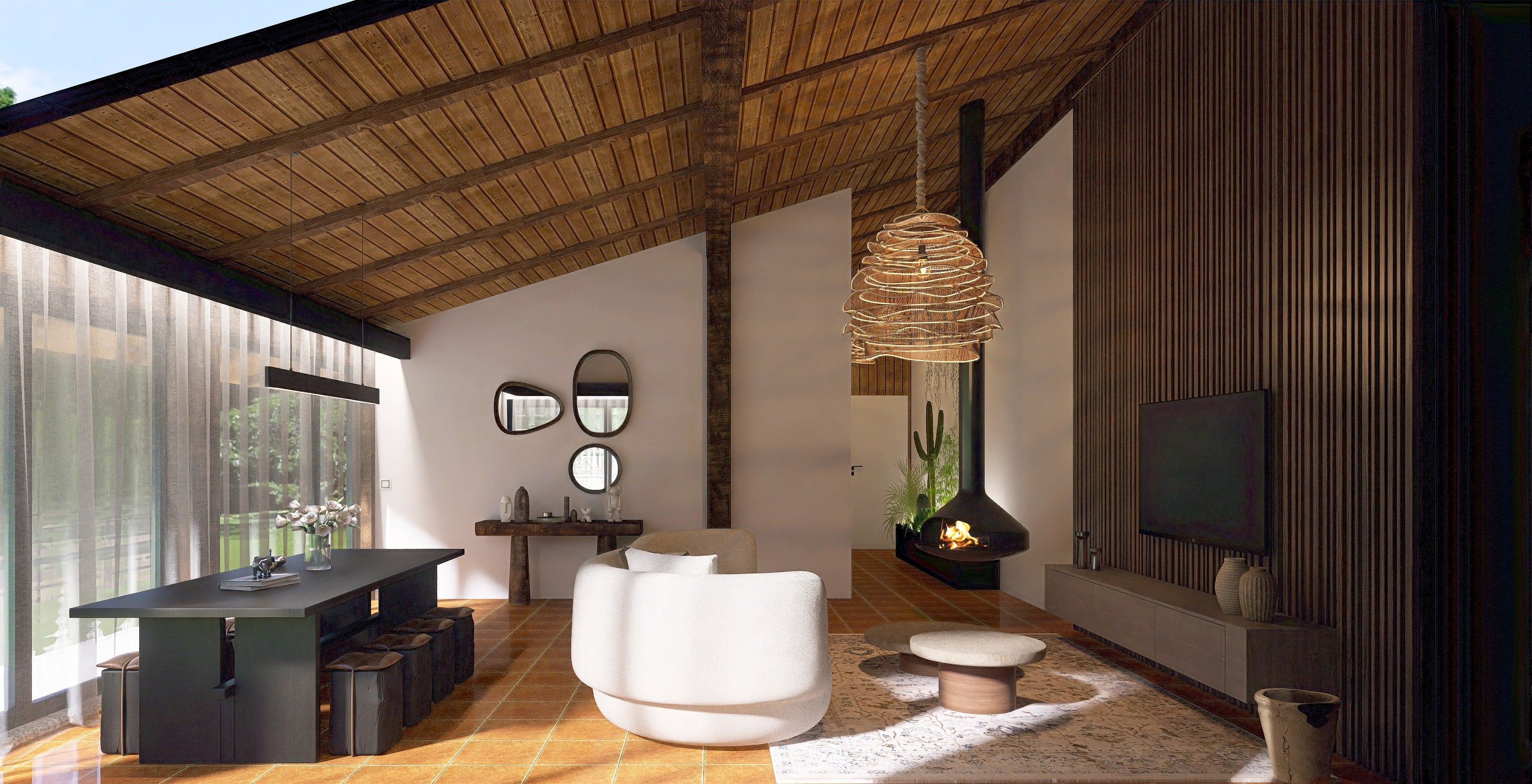 Le salon s’articule autour de tons boisés, mettant en valeur une architecture brute et typique. Le bois foncé apporte du caractère, en contraste avec un carrelage classique qui ancre l’ensemble dans une sobriété élégante. Les courbes organiques viennent adoucir les lignes rectilignes, apportant équilibre et douceur à l’espace.