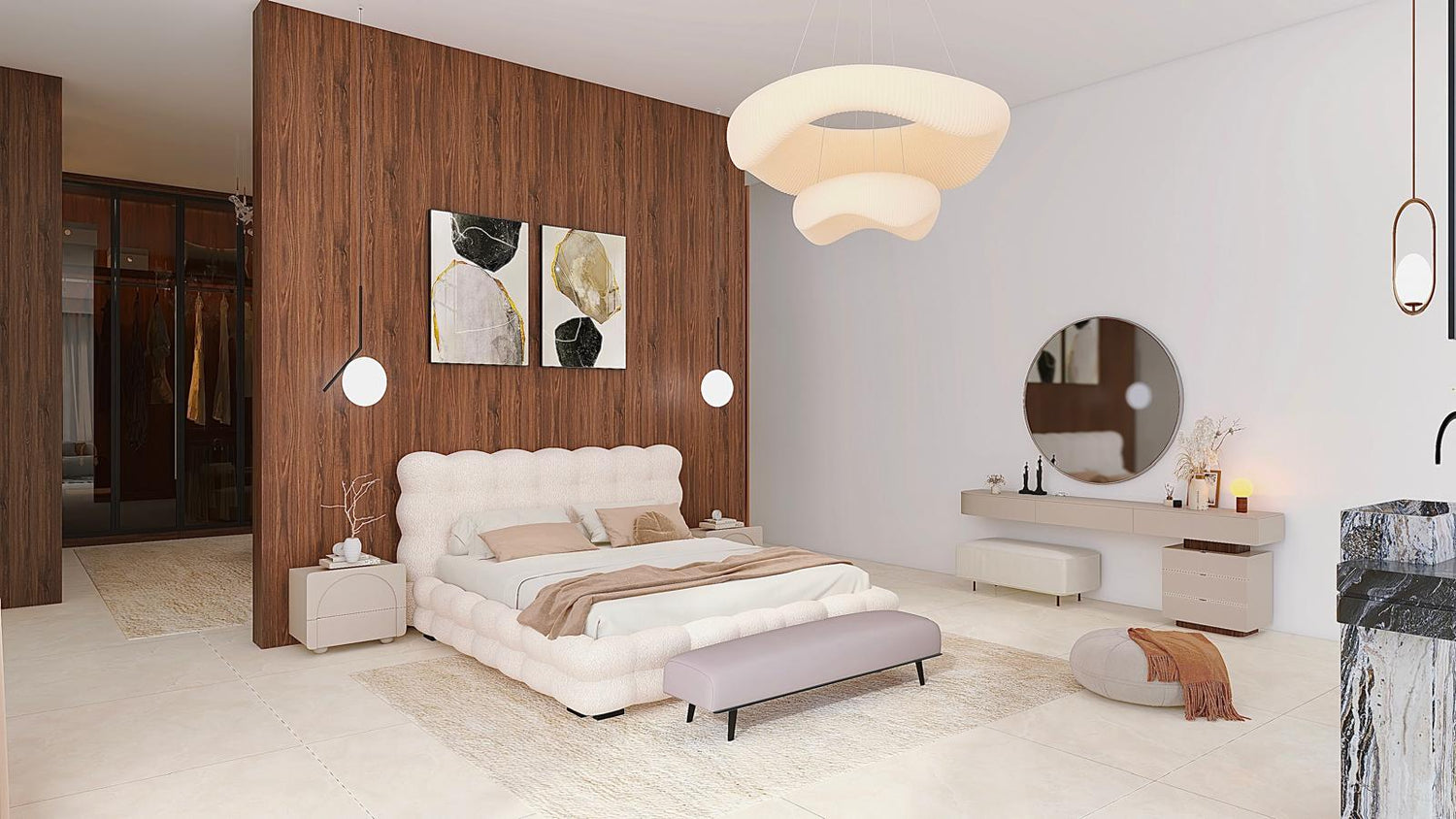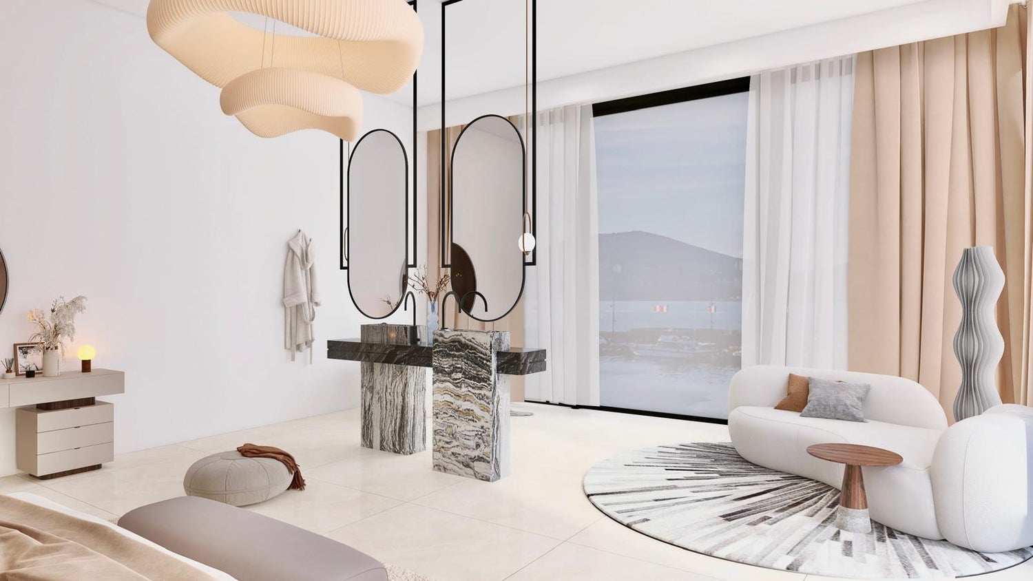 Le lit, placé au centre de la pièce, est subtilement entouré d’un mur séparant le dressing. Face à lui, la salle d’eau avec baignoire crée un espace parfait pour se détendre. L’ambiance cosy et raffinée est magnifiée par une vue imprenable sur la mer, apportant sérénité et bien-être.