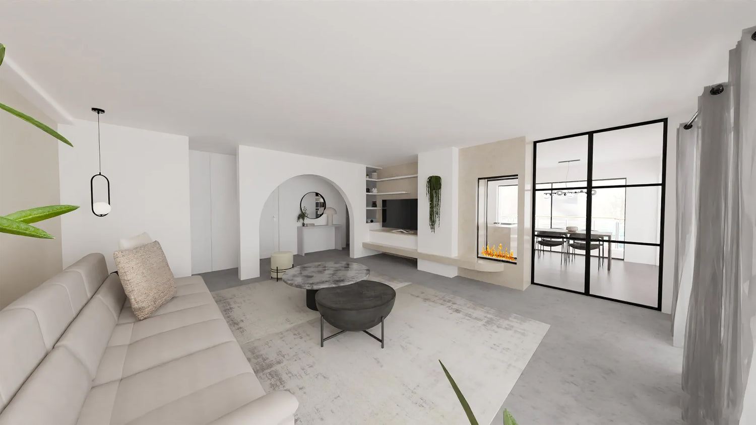 Dans cet appartement situé à Cap d’Ail, le projet visait à rénover et réorganiser les espaces de manière plus fonctionnelle et fluide. L’intervention principale s’est concentrée sur la transformation de la cuisine, désormais positionnée à côté du salon, séparée par une grande porte en verre.